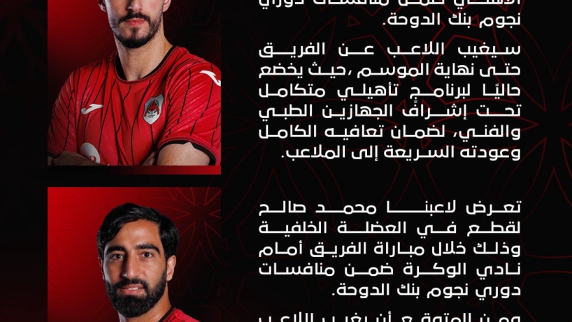 تعرض لاعبنا عميد محاجنه لقطع في الرباط الجانبي، وذلك خلال مباراة الفريق أمام نادي الأهلي ضمن منافسات دوري نجوم بنك الدوحة.